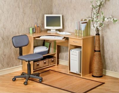 Affordable desk maximizes underused corner space. Holds computer monitor printer and supplies with a keyboard shelf drawer and storage shelves. MyHome corner computer desk453/8"W x 351/2"D x 291/2"HLeft side of desk 351/2" to back corner Right side of desk 453/8" to back corner Veneered engineered wood Assembly required Read more